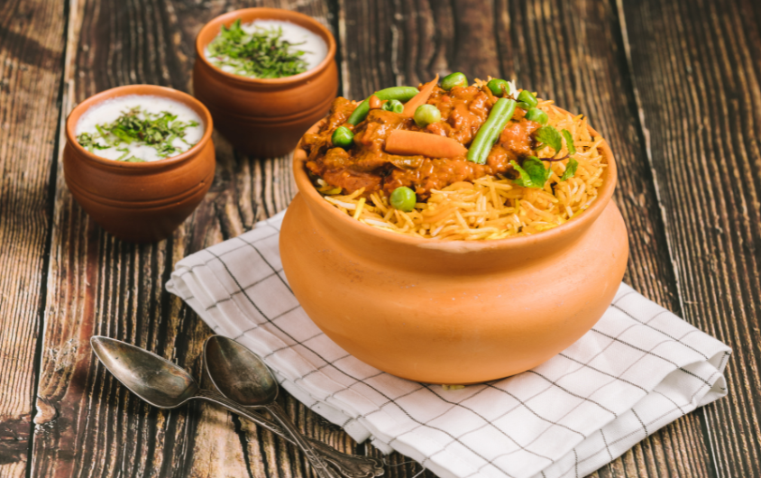 - Add half rice, top with fried onions, saffron milk & ghee.